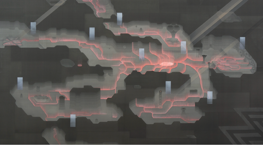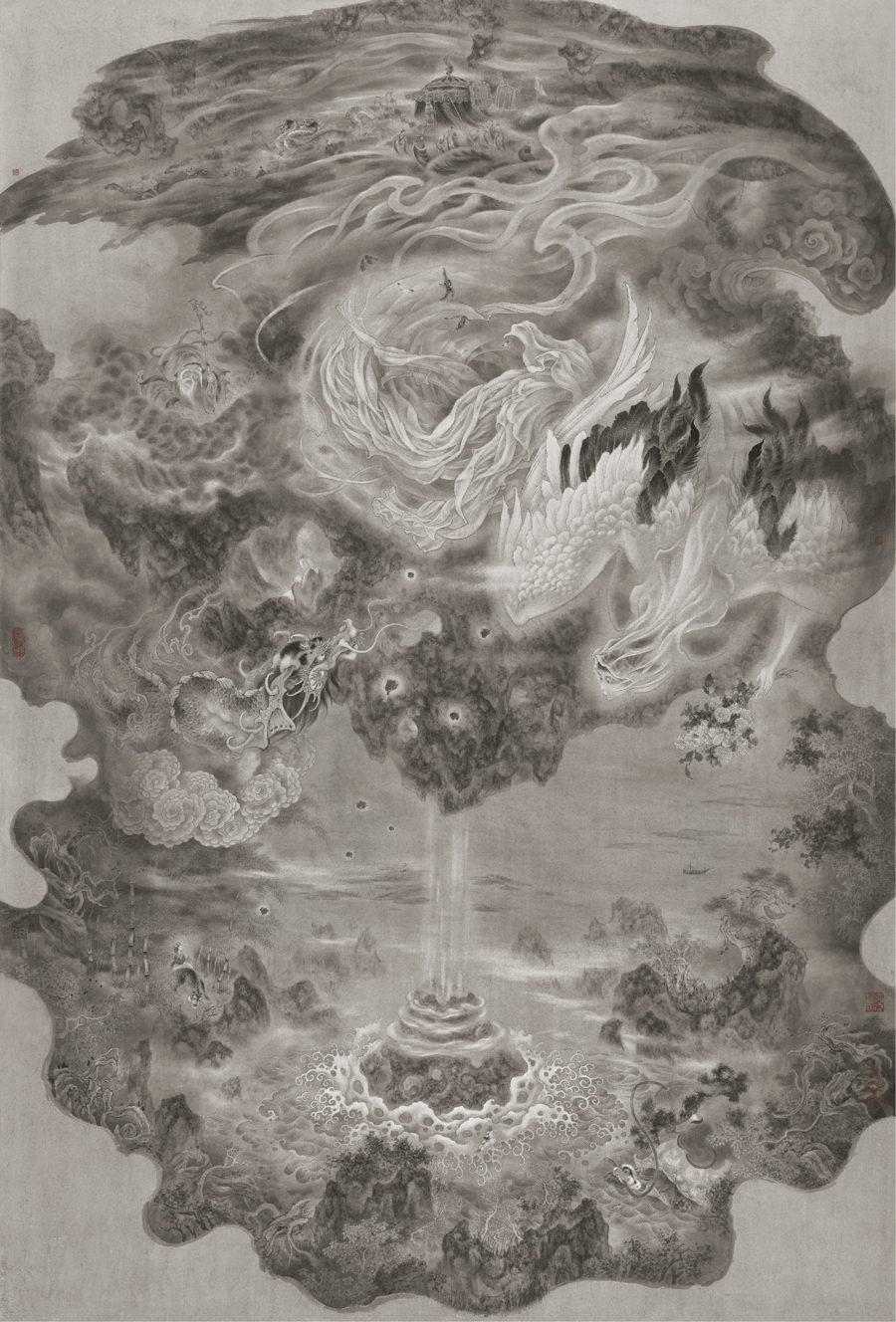 新锐艺术家组获奖者文晢的《神的游戏》以绢本设色与矿植物颜料为媒介,在深厚的传统工艺基础上引入独特的图像构成方式,突破了绘画的平面性边界。评委陈侗认为,文晢以深厚的笔墨功底和敏锐的当代意识,突破了中国画尤其是工笔画在题材与表现范畴上的既有界限。他的创作在科技、游戏与绘画之间架起了一座富有张力的桥梁,使作品在媒介与观念层面形成了不可分割的整体性。这种整体性的探索,展现了他对艺术语言重塑的清晰目标与独特路径,也标志着当代水墨在观念与方法论上的一种重要延展。