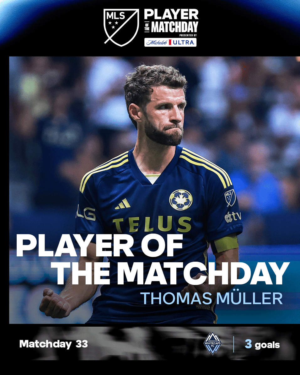 美职联官方宣布,36岁的老将穆勒当选为本轮联赛的最佳球员。